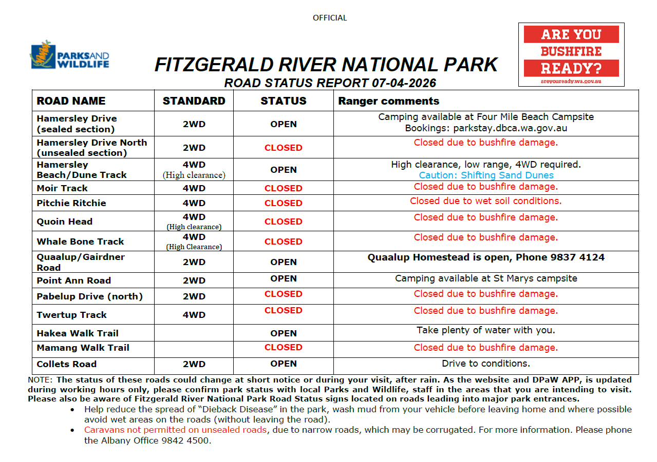 Here are the latest road closures within the Fitzgerald River National Park's Road Condition Report Tuesday, 7 April 2026 obtained from Parks and Wildlife Service, Western Australia's which stays in effect until further notice (please check the DBCA's Parks Alert in case of any changes):