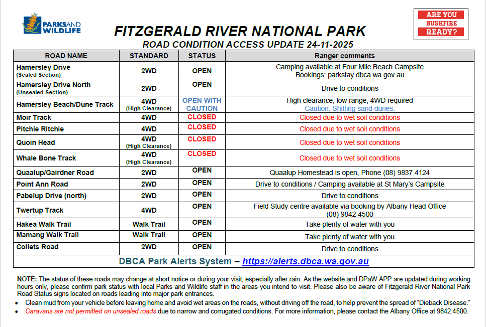 Here are the latest road closures within the Fitzgerald River National Park's Road Condition Report Monday, 24 November 2025 obtained from Parks and Wildlife Service, Western Australia's which stays in effect until further notice (please check the DBCA's Parks Alert in case of any changes):