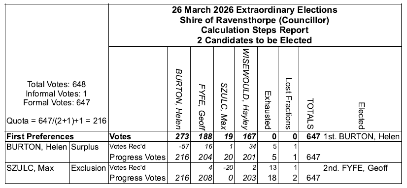 As per the official declaration of results for the Shire of Ravensthorpe Local Government Election held on 26 March 2026, Helen Elizabeth BURTON and Geoffrey Neil FYFE have been duly elected as Councillors for the Ravensthorpe District.