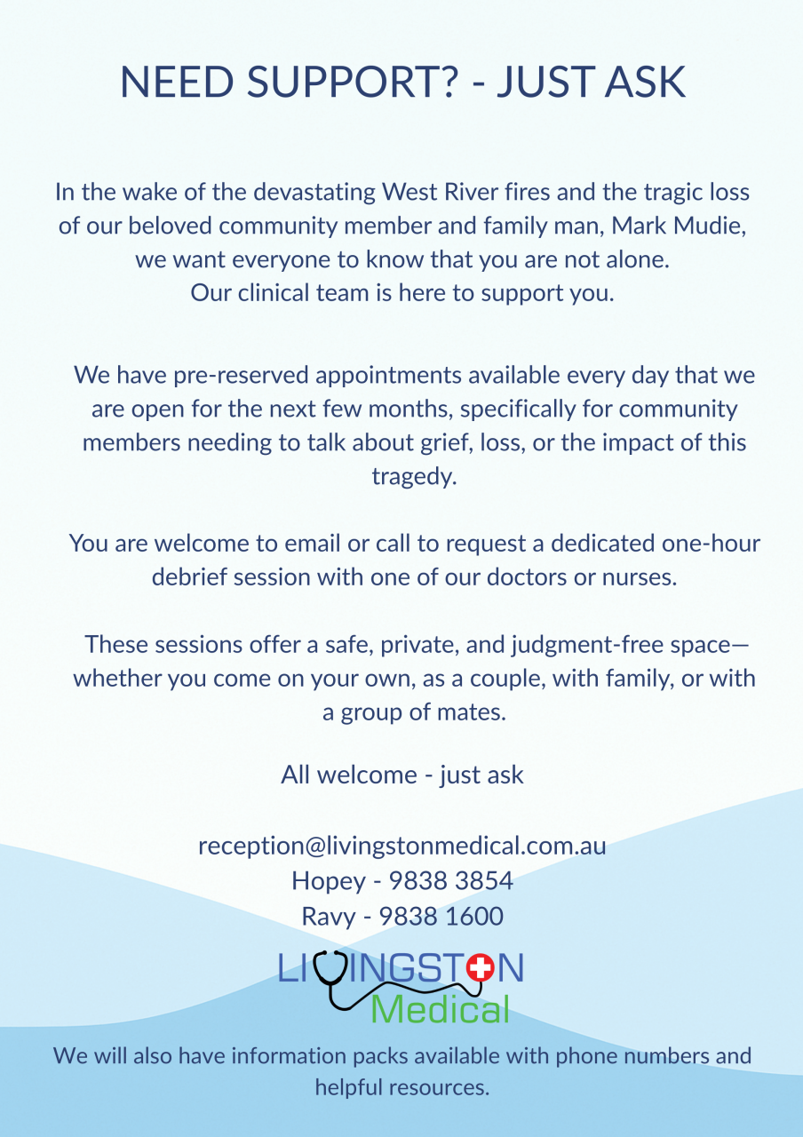 Livingston Medical have clinics in both Ravensthorpe and Hopetoun and they are setting aside appointment times especially for those who might need to speak to a professional.