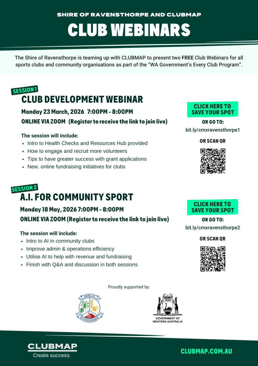 The Shire of Ravensthorpe is teaming up with CLUBMAP once more to present two more FREE webinars for sports clubs and community groups.