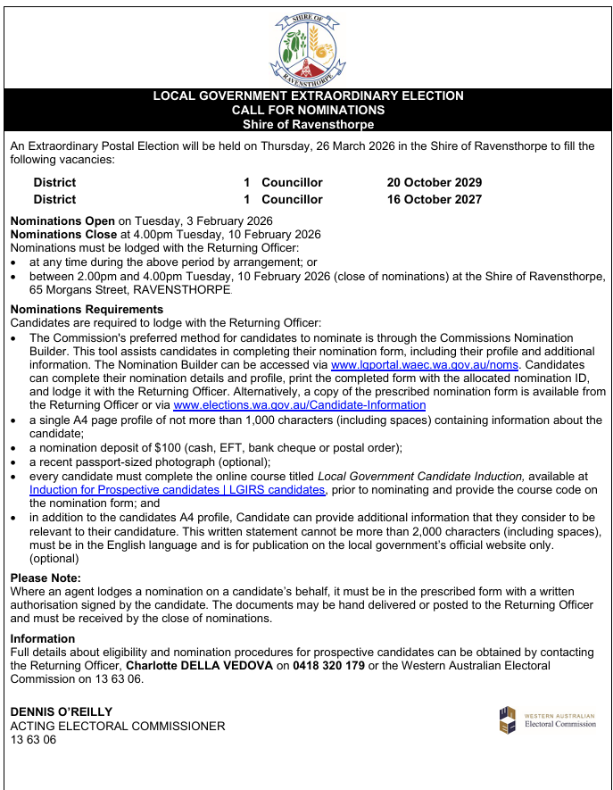 The Shire of Ravensthorpe is holding an Extraordinary Postal Election on Thursday 26 March 2026.